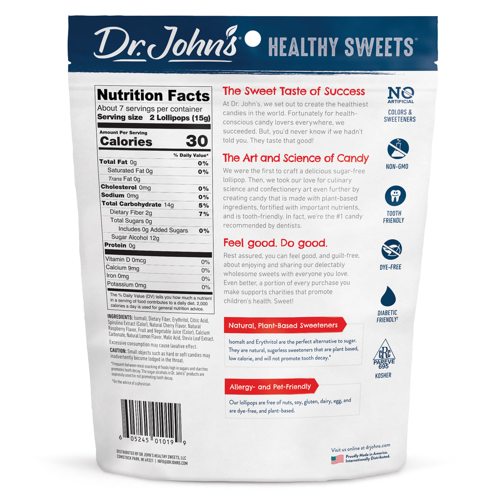 Celebrate bold stripes, bright stars, and the best flavors with our Patriotic Pops. Not only are our lollipops made right here in America, but they are also made with no artificial sweeteners, colors, or flavors. Enjoy a swirl of Cherry, Lemon, and Blue Raspberry in each pop.