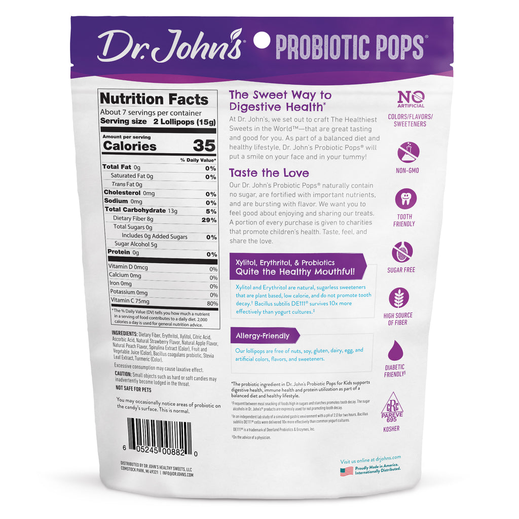 Make your tummy happy and keep your smile wide with our great tasting pops that are full of fiber and probiotics to help promote healthy digestion. Flavors include: Strawberry and Wildberry.
