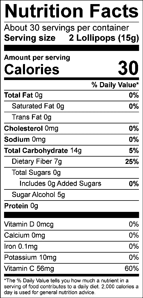 Dextrin (dietary fiber), Erythritol, Xylitol, Chocolate Liquor, Citric Acid, Ascorbic Acid, Natural Chocolate Flavor, Natural Orange Flavor, Fruit and Vegetable Juice (Color), Stevia Leaf Extract, Natural Vanilla Flavor.