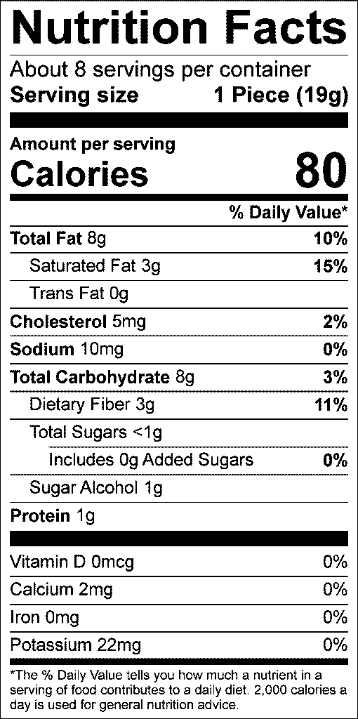 Dark Chocolate (Cocoa Butter, Cocoa Powder, Erythritol, Inulin, Sunflower Lecithin, Stevia Leaf Extract), Pecans, Cream, Tapioca Fiber, Allulose, Salted Butter (Milk), Inulin, Natural Vanilla Flavor, Sunflower Lecithin, Sea Salt, Stevia Leaf Extract.
